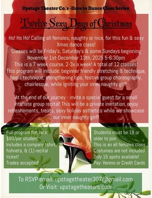 Must be 18 or older and females only! This program will include: beginner friendly stretching & technique, heels technique, strengthening tips, festive group choreography, chairlesque, while igniting your inner naughty girl! At the end of the journey--invite a special guest for a small intimate group recital! This will be a private invitation, enjoy refreshments, treats, sexy holiday aesthetics while we showcase our inner naughty girl!!