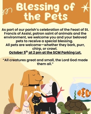 As part of our parish's celebration of th Feast of St Francis of Assisi, patron saint of animals and the environment, we welcome you and your beloved pets to receive a special blessing. All pets are welcome--whether they purr, bark, chirp or crawl.