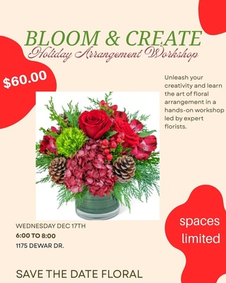 Grab your friends and join us for a fun evening creating this gorgeous holiday arrangement.  Only 8 spots available, so make sure to pre-pay to save your seat!  Come relax, laugh, and get into the holiday spirit with us!
