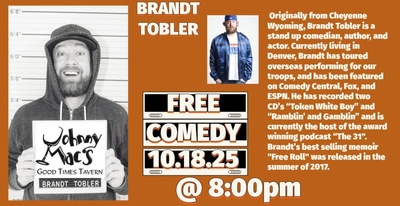 Originally from Cheyenne, Brandt Tobler is a stand up comedian, author, and actor.  Currently living in Denver, Brandt has toured overseas performing for our troops, and has  been featured on Comedy Central, Fox, and ESPN.  He has recorded two CD's "Token White Boy" and "Ramblin' and Gamblin" and is currently the host of the award winning podcast "The 31".  Brandt's best sellling memoir "Free Roll" weas released in thek summer of 2017.