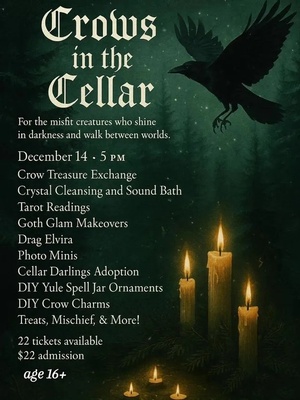 Crow Treasure exchange, crystal cleansing and sound bath, tarot readings, goth glam makeovers, drag Elvira, photo minis, cellar Darlings adoption, DIY yule spell jar ornaments, DIY crow charms, treats, mischief, and more!