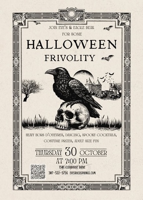 Join us for an evening where we transfom Eve's into a spookily beautiful setting for an adult evening filled with delicious food, drink, music by Eagle Beak, dancing and costume prizes.  Mingle with friends, meet new ones, and enjoy a special evening here at Eve's.  We'll serve a great array of heavy hors d'ouevres and desserts, enough to fuel you for an evening of dancing and fun.  The bar will be creating a whole separate collection of spooky cocktails, for purchase.  Let your inner kid shine and dress up for a great evening with friends and neighbors alike.