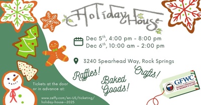 Join us for the 2025 Holiday House, put on by GFWC Women's Club of Sweetwater County! Tour a beautiful home, decorated for the holidays. Handmade crafts and baked goods for sale. Raffle items (get your tickets from a club member now or purchase on site). Tickets are $5 each or 6 tickets for $20. Drawing at 1pm on Saturday. All proceeds support the Women's Club of Sweetwater County in their effort to support worthwile causes throughout the community.