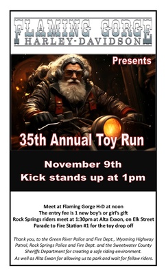 The 35th Annual Toy Run rides out of Flaming Gorge Harley-Davidson. Rock Springs riders meet us at the Alta Exxon on Elk Street at approximately 1:20pm. We'll parade to Fire Station #1 for the toy drop off. Thank you, Green River Police and Fire Departments, Wyoming Highway Patrol, Rock Springs Police and Fire Departments and the Sweetwater County Sheriff's Department. You give all riders a safe riding environment. Thanks also to the Alta Exxon for allowing us to gather in your parking lot.